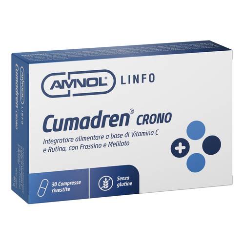 CUMADREN CRONODescrizione Integratore alimentare a base di vitamina C, rutina ed estratti di meliloto e frassino. L'estratto di meliloto favorisce la funzionalità del microcircolo e l'estratto di frassino è utile per il drenaggio dei liquidi corporei. Proprietà: - meliloto: l'estratto titolato in cumarina (5,6-benzo-alfa-pirone) favorisce la corretta funzionalità del microcircolo e il drenaggio dei liquidi corporei; - rutina: sostanza che appartiene alla famiglia dei bioflavonoidi ed è composta da quercetina e rutinosio; - frassino: l'estratto ottenuto dalle foglie è utile per il drenaggio dei liquidi corporei; - vitamina C: c...