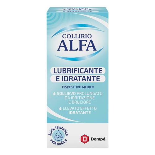 COLLIRIO ALFA LUBRIFICANTE E IDRATANTE Descrizione Dispositivo Medico CE. Sterile. Soluzione oftalmica a base di Acido Ialuronico ad alto peso molecolare, ottenuto per sintesi biotecnologica. L'Acido Ialuronico è una sostanza che dà origine a soluzioni mucomimetiche con elevate proprietà lubrificanti; la viscosità di suddette soluzioni è tale da consentire un elevato effetto idratante e una stabilizzazione del film lacrimale. Le qualità umettanti e protettive dell'Acido ialuronico conferiscono un sollievo prolungato agli occhi nel caso di irritazione, bruciore e sensazione di corpo estraneo dovuti a fattori ambientali (vento, sole, f...
