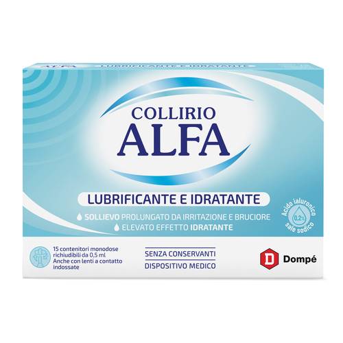 COLLIRIO ALFA LUBRIFICANTE E IDRATANTE Descrizione Dispositivo Medico CE. Sterile. Soluzione oftalmica a base di Acido Ialuronico ad alto peso molecolare, ottenuto per sintesi biotecnologica. L'Acido Ialuronico è una sostanza che dà origine a soluzioni mucomimetiche con elevate proprietà lubrificanti; la viscosità di suddette soluzioni è tale da consentire un elevato effetto idratante e una stabilizzazione del film lacrimale. Le qualità umettanti e protettive dell'Acido ialuronico conferiscono un sollievo prolungato agli occhi nel caso di irritazione, bruciore e sensazione di corpo estraneo dovuti a fattori ambientali (vento, sole, f...