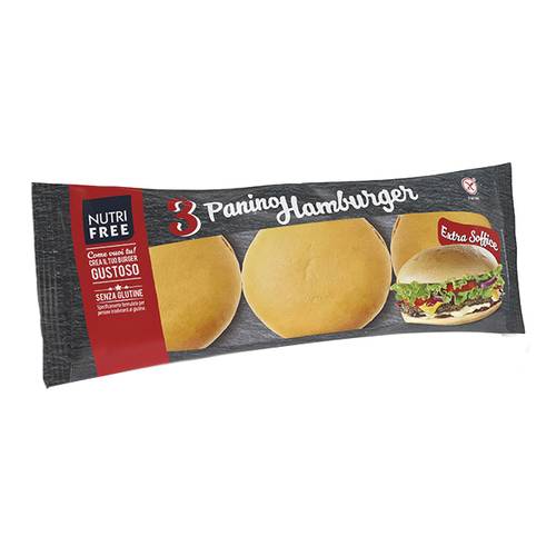 Panino HamburgerIngredienti Amido di mais, acqua, zucchero, olio di semi di girasole, farina di riso; addensante: idrossi-propil-metilcellulosa; lievito; emulsionante: mono- e digliceridi degli acidi grassi; fibre di psyllium, proteine di soia, sale; agenti lievitanti: difosfato disodico, carbonato acido di sodio; aromi. Trattato in superficie con alcol etilico. Può contenere tracce di lupini e senape. Senza glutine e senza lattosio. Caratteristiche nutrizionali Valori medi per 100 g Energia 270 kcal/1.139 kJ Carboidrati di cui zuccheri 50 g 8,8 g Grassi di cui grassi saturi 6,2 g 0,8 g Fibre 2...
