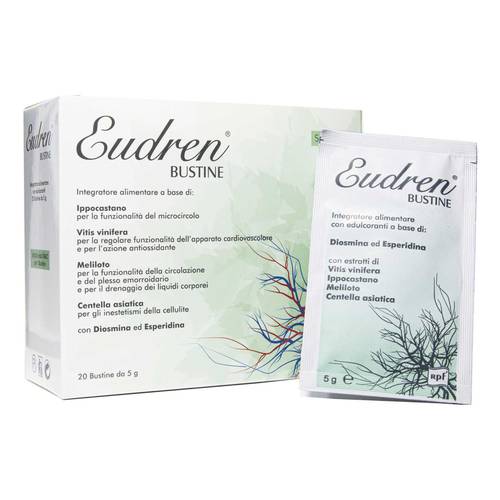 EudrenBUSTINE Descrizione Integratore alimentare a base di estratti vegetali standardizzati, diosmina ed esperidina. L'ippocastano, la centella, la vite rossa e il meliloto favoriscono la funzionalità del microcircolo. La vite rossa è importante per la regolare funzionalità dell'apparato cardiovascolare e per la sua azione antiossidante. Il meliloto contribuisce alla funzionalità della circolazione venosa (funzionalità del plesso emorroidario) e al drenaggio dei liquidi corporei. La centella contrasta gli inestetismi della cellulite.. Ingredienti Edulcoranti: maltitolo, eritritolo, sucralosio; diosmina, esperidina, centell...