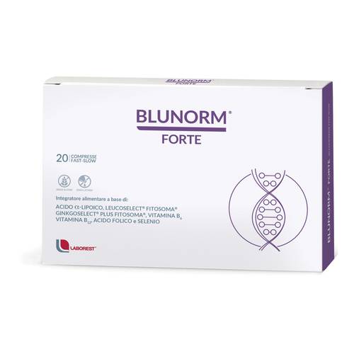 Blunorm Forte lntegratore alimentare a base di acido α-lipoico (acido titottico), estratti di Ginkgo biloba e di Vitis vinifera. Con Vitamine del gruppo B e Selenio, utili per apportare una quota supplementare di tali nutrienti. Ginkgo biloba e Vitis vinifera svolgono un'azione antiossidante e favoriscono la funzionalità del microcircolo. Il Ginkgo favorisce inoltre la normale circolazione del sangue. Le vitamine del gruppo B e l'acido folico contribuiscono inoltre alla riduzione di stanchezza ed affaticamento. Ingredienti Acido alfa-lipoico, agenti di carica: fosfati di calcio, cellulosa, leucoselect fitosoma (leucocianidine...