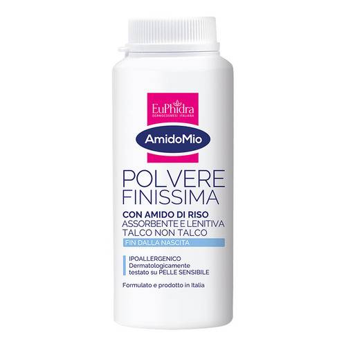 EuPhidra AmidoMio Polvere finissimaDescrizione Polvere per il cambio pannolino e il dopo bagno. Lenisce gli arrossamenti, previene le irritazioni e mantiene la pelle asciutta e morbida, senza ostacolare la normale traspirazione cutanea. È una polvere impalpabile che mantiene la pelle asciutta e protetta, prevenendo fenomeni di macerazione. Indicata per i bambini fin dai primi mesi, le particelle fini di amido di riso creano un film assorbente e lenitivo, che permette la naturale traspirazione della pelle, lasciandola morbida e levigata. Privo di talco, conservanti, oli minerali. - Testata per nichel e metalli pesanti - Tes...